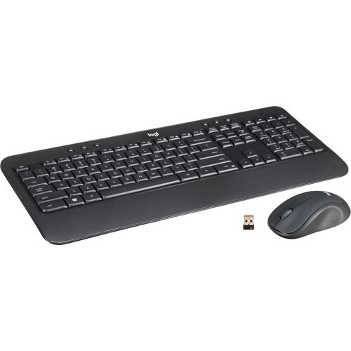 This MK540 Advanced Wireless Mouse and Keyboard Bundle from Logitech is a convenient solution for your computing needs. With wireless 2.4 GHz connectivity on both the keyboard and mouse, you won't have to worry about cable management or cords not being long enough. The keyboard features an integrated palm rest and adjustable feet for comfort while the mouse has a contoured, ambidextrous shape and soft rubber grips. Moreover, the spill-resistant keyboard features convenient and essential hotkeys for quick access to frequently used functions such as volume adjustments. Simply plug in the included Unifying USB receiver and you're all set. Both the keyboard and mouse use AA batteries and can last up to 36 and 18 months of use, respectively.