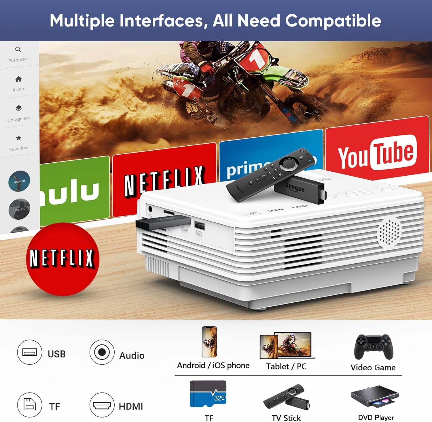 • [Wide Compatibility and Application] Equipped with HDMI, USB, Micro SD interfaces, the projector is compatible with TV Box, TV Stick, PCs, Laptops, Tablets, USB Flash Drive, players. It’s supposed to apply many environment—Home Theater, Video Game, Party, Outdoor activities. You can use it for small meeting in dark room, but it is not a professional office projector for PPT or text. As the copyright, some videos (such as Netflix) can't be played via phone connection (wifi or usb).