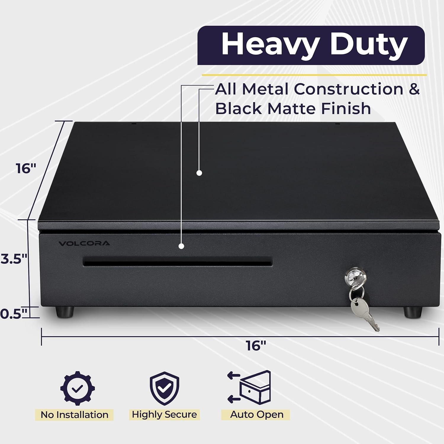 The Volcora 500050-H Cash Drawer is a heavy-duty 16-inch POS solution designed for retail stores, restaurants, and high-traffic checkout environments. Built with a durable metal frame and a stainless steel front panel, it offers enhanced resistance to wear and tampering while maintaining a professional, modern look. The included under-counter mounting bracket allows for space-saving installation, making it ideal for compact workstations.