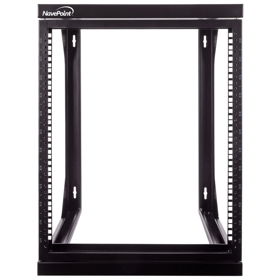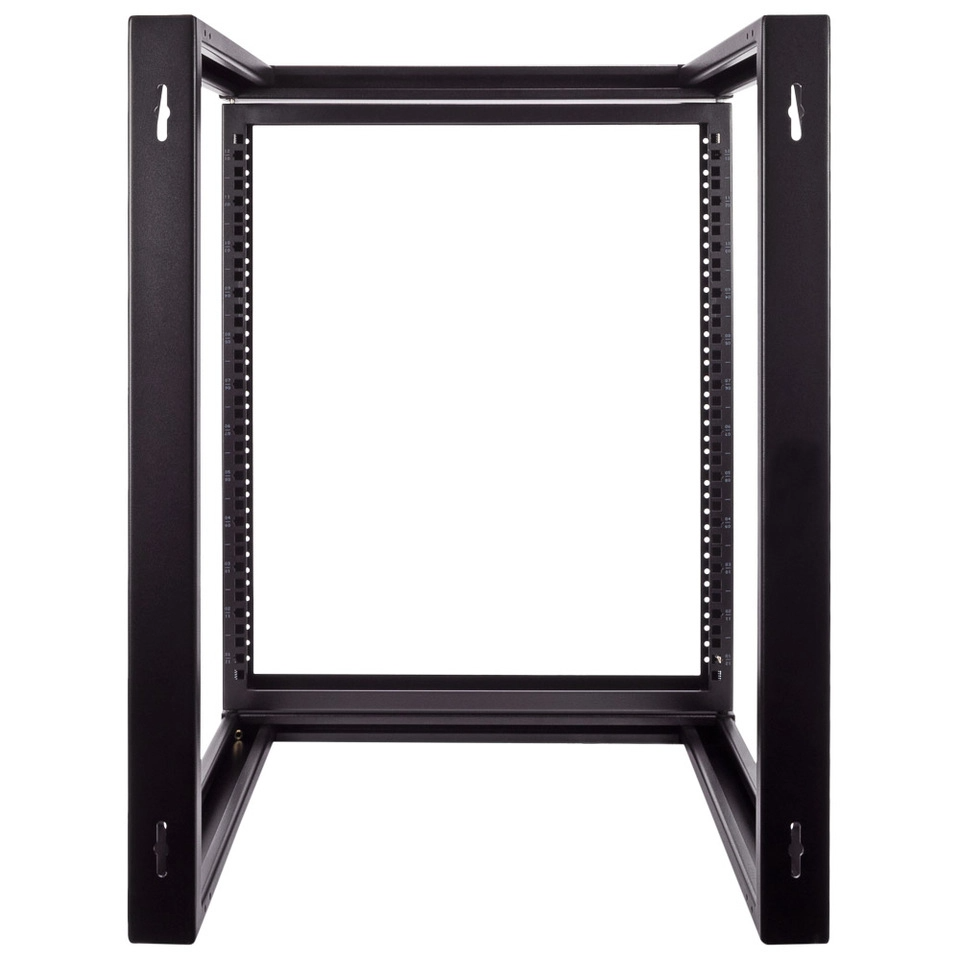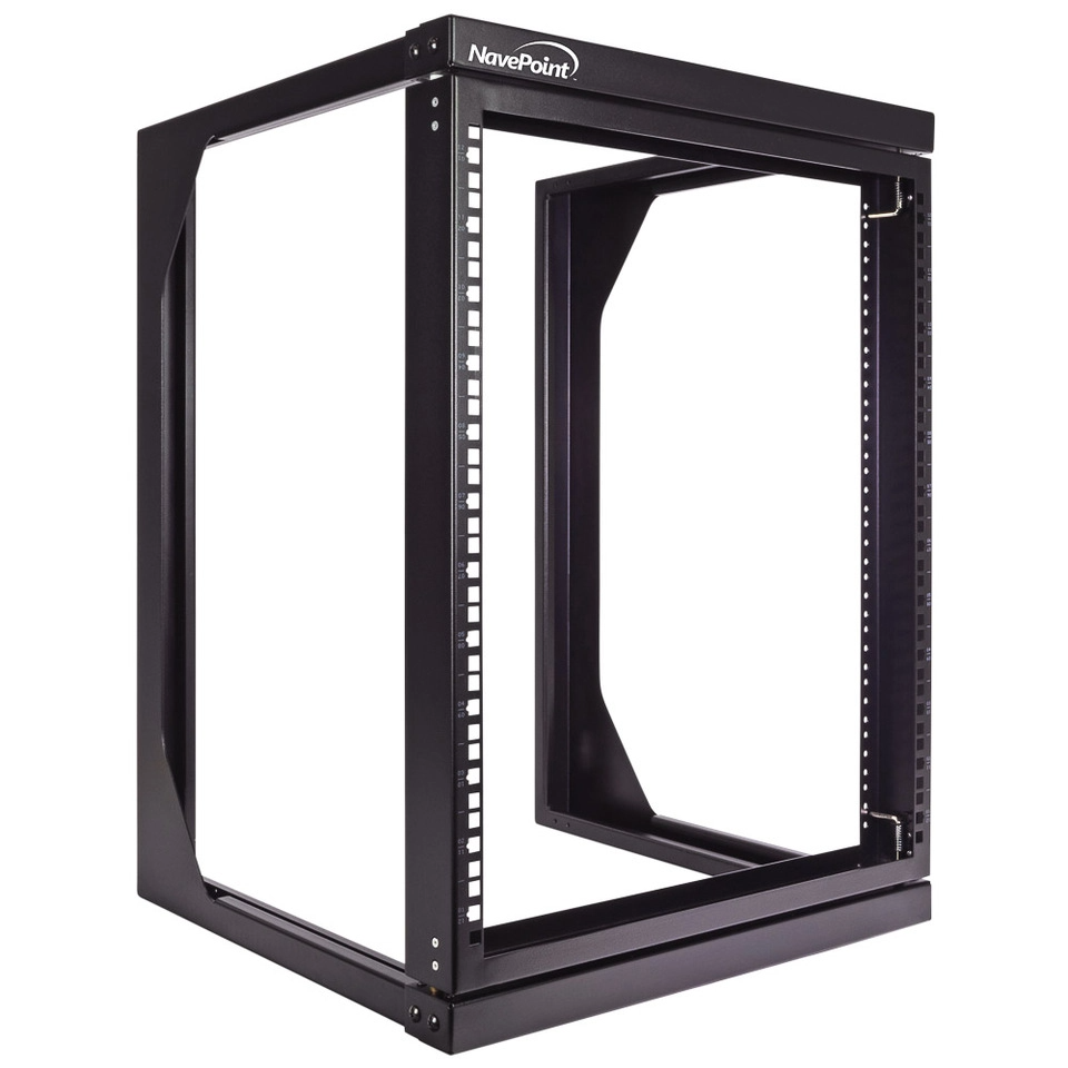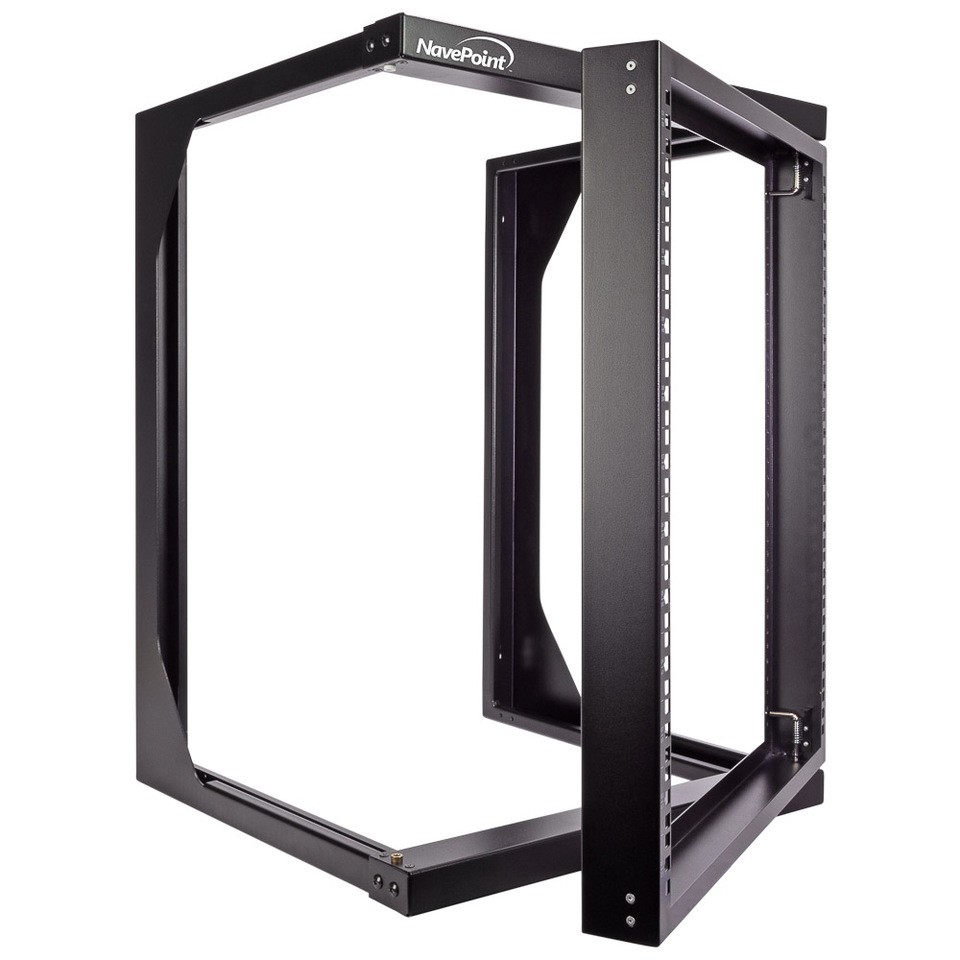 Use space efficiently with this NavePoint 12U swing gate wall-mounted rack for your standard 19" servers and AV and networking equipment. The dual-hinged front swing gate easily opens to a 180-degree angle for easy rear cable access from either side. Spring-load pivot pins provide for either left or right hinging, so you can choose what works for your build. Open design allows airflow and great overall access for equipment installation, servicing, and cable management.